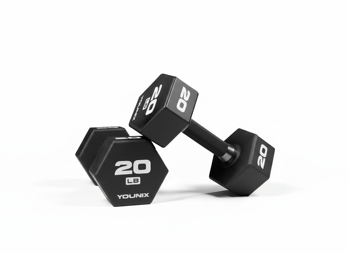 Unlike traditional rubberized dumbbells, Younix's design boasts solid steel Hex heads with a shockabsorbent urethane plating, fully over-molded to the center. These dumbbells provide a fluid and compact lifting experience while safeguarding your flooring from damage during drops or floor work.
