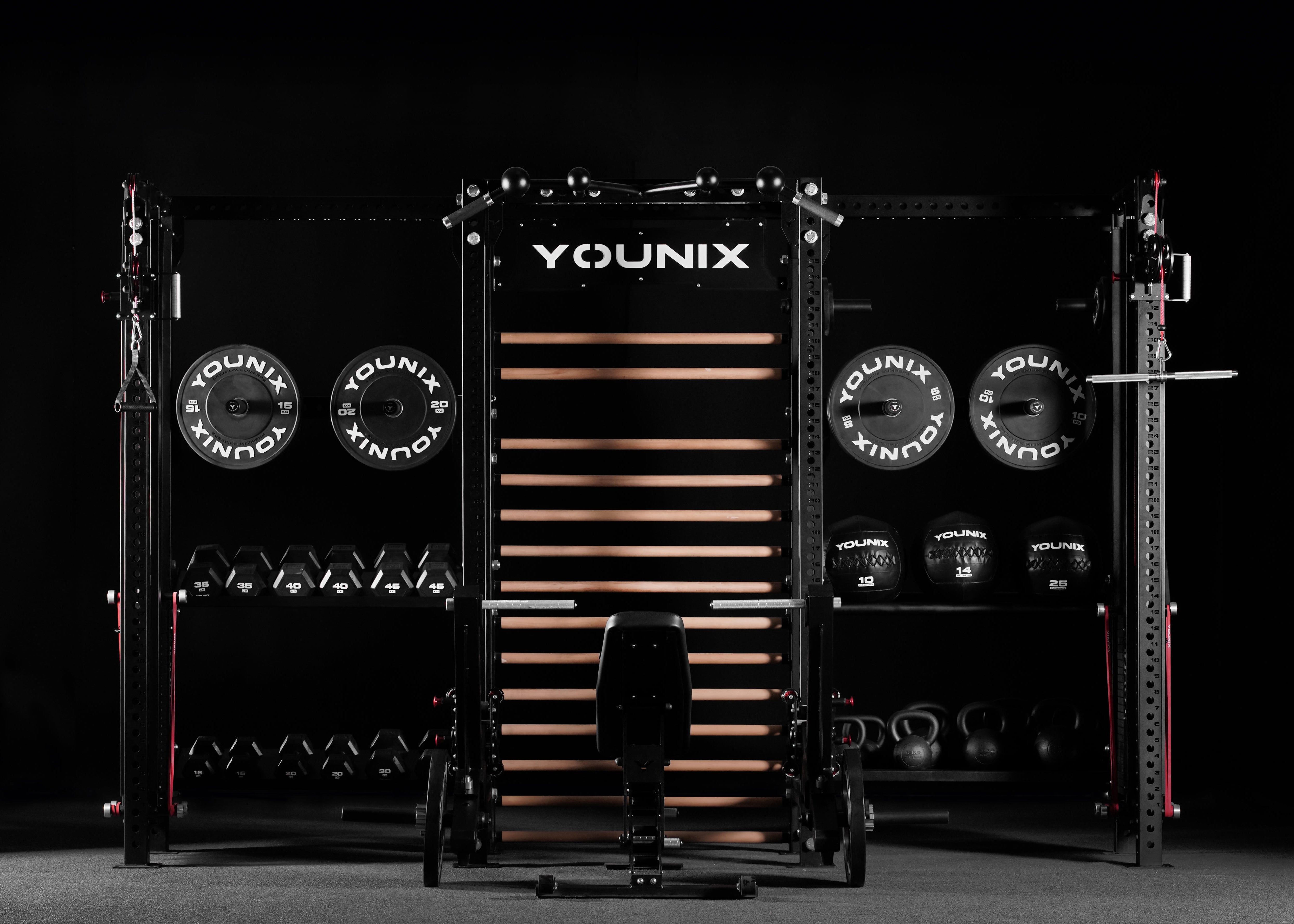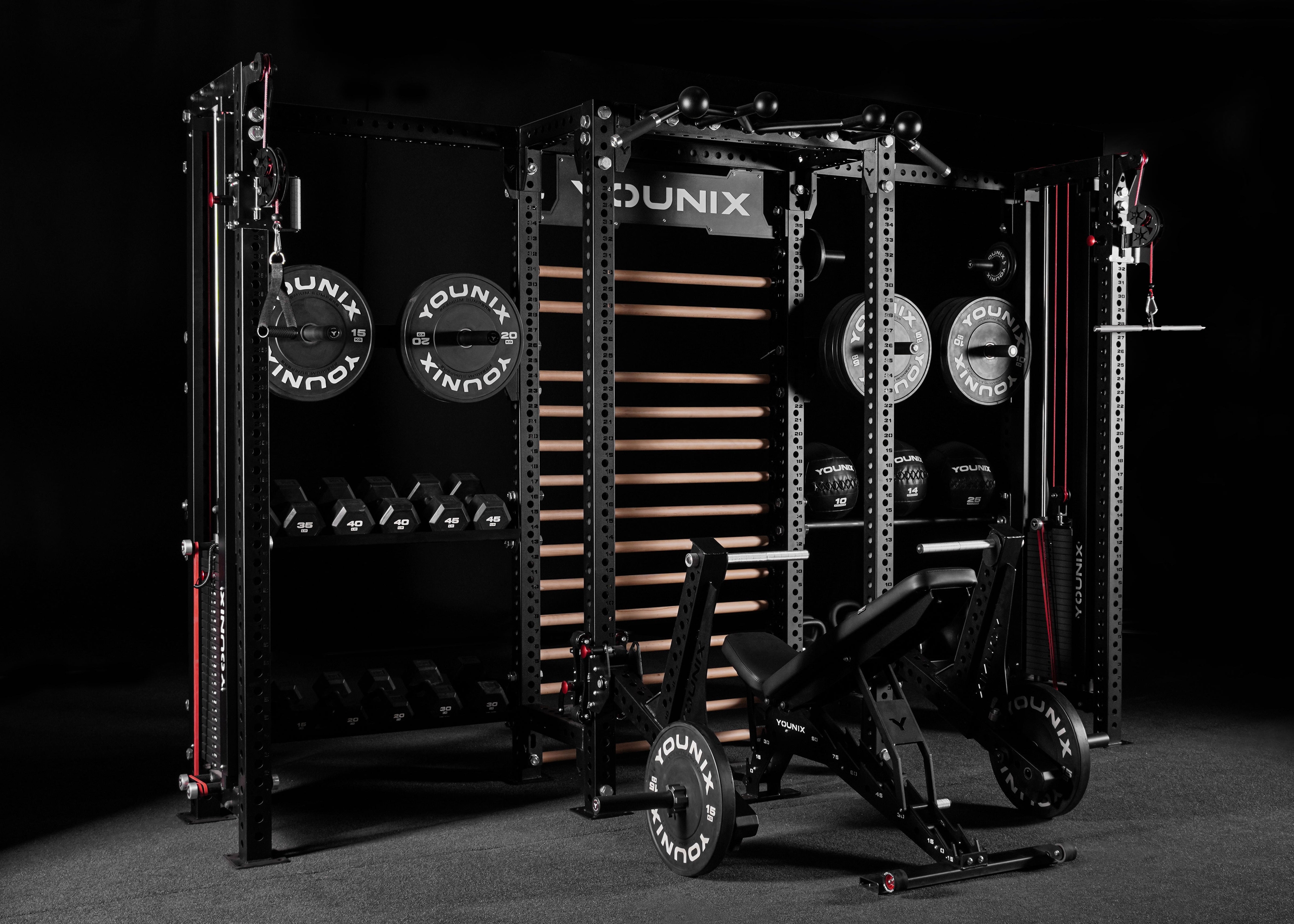 Questa configurazione rispetta pienamente il sistema modulare Younix. Puoi aggiungere Landmine, Half Safety, Wall Ball Target, più perni di stoccaggio e persino estendere questa configurazione all'infinito. Collega più rack, più cavi, più leve in fila per ottenere un look & feel unico e la configurazione di allenamento ottimale per le tue esigenze.