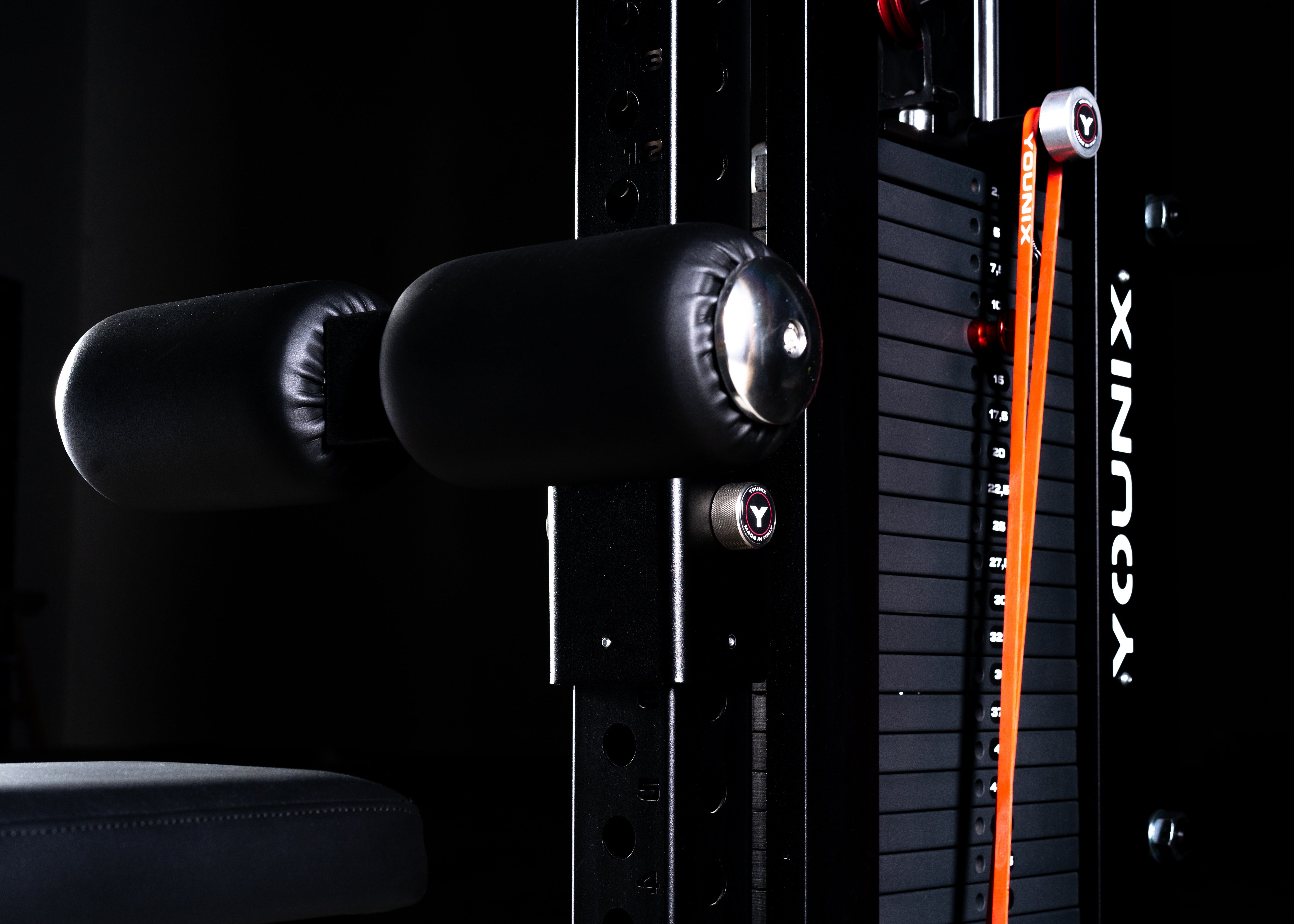 Puoi usare qualsiasi tipo di panca come seduta perfetta per la tua nuova Lat Machine. Fai scorrere la panca in posizione orizzontale sotto l'attacco per le ginocchia, siediti e scegli l'altezza ideale dell'attacco, selezionando la distanza corretta.