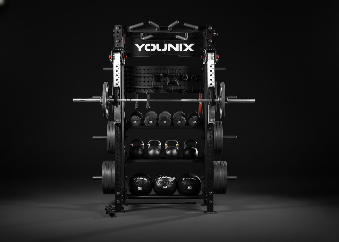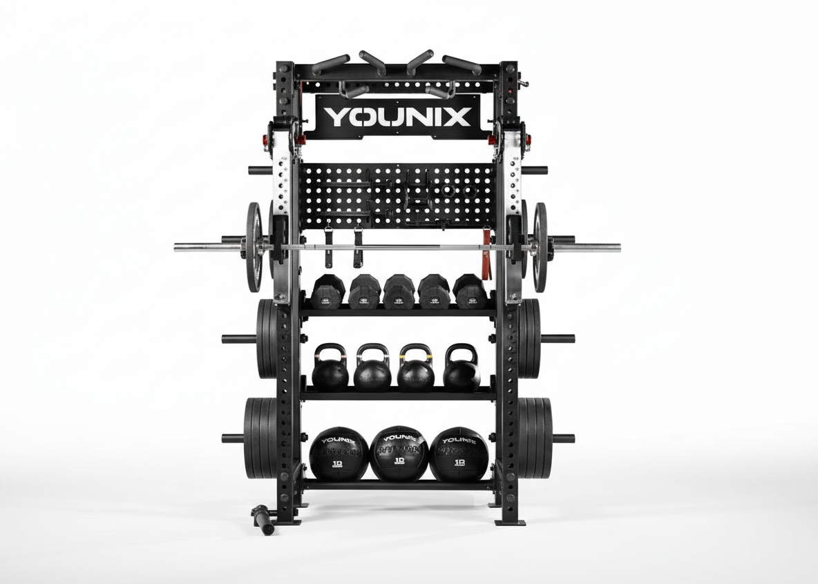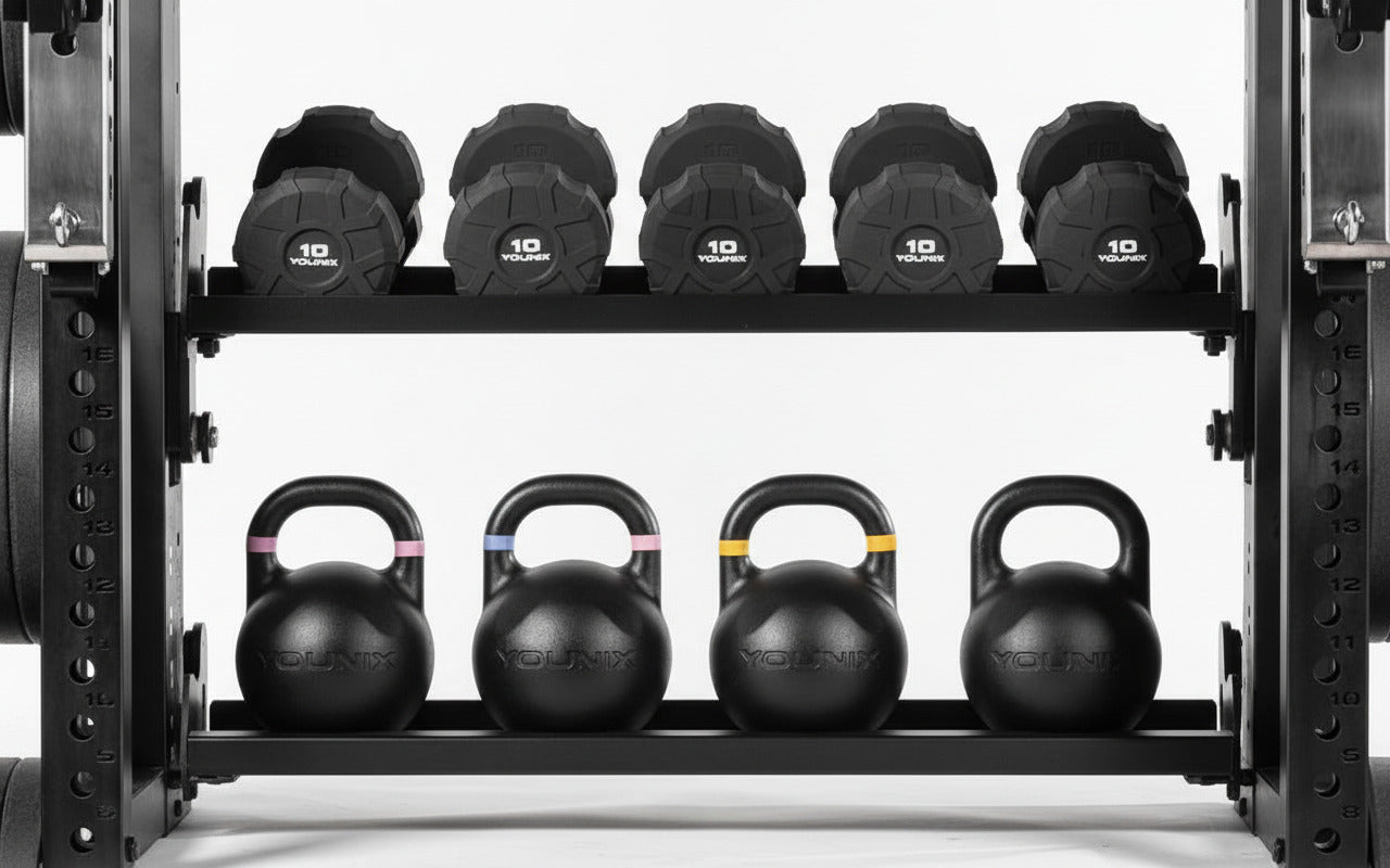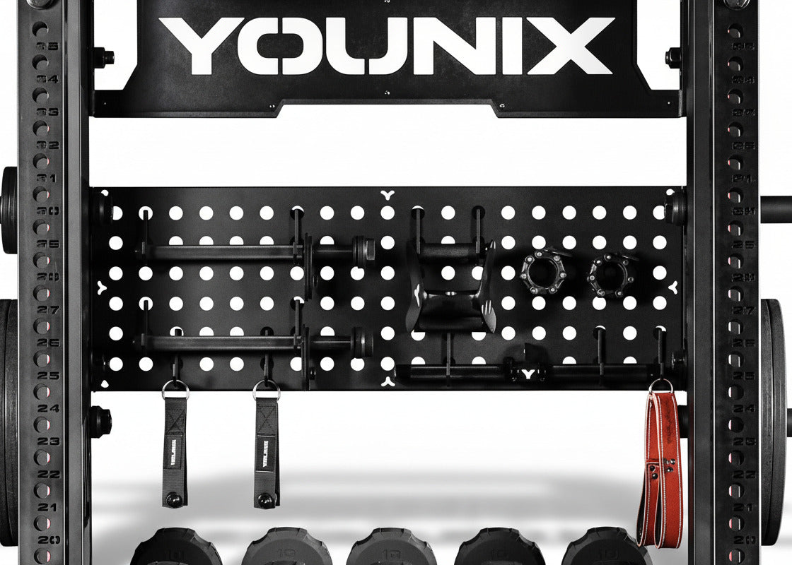 La mensola a tubi è fornita con piastre laterali che ne consentono il montaggio tra i montanti posteriori di qualsiasi rack Younix. Grazie a questo sistema di fissaggio, le mensole si estendono dietro il rack senza interferire con la funzionalità interna. È la soluzione perfetta per riporre bumper, palle mediche e slam ball.