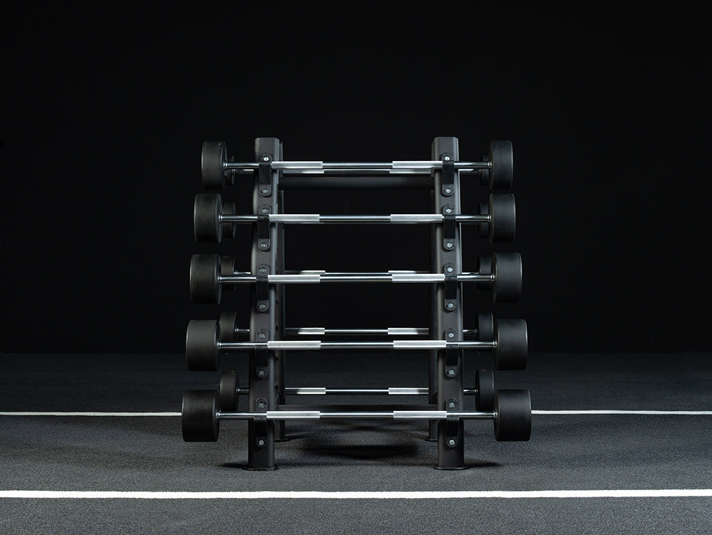 Designed for intensive professional use, the barbells are made of chrome-plated steel, marked in kg or in lb, with deep knurling, and non-rotating weight plates. The solid steel bar, welded to the plates, is fully encased in rubber for increased durability and reduced noise.