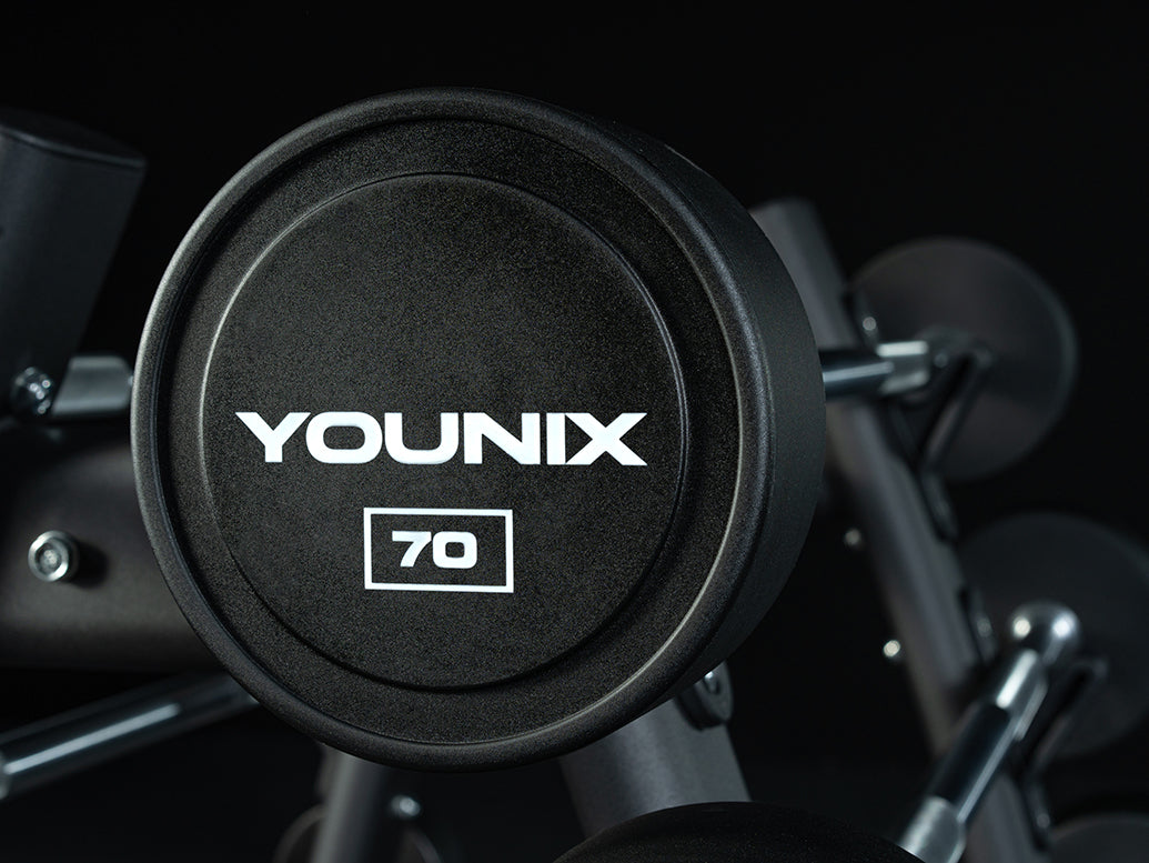 The barbells boast a variety of premium features, including a cast polyurethane finish for durability, hardened chrome steel handles for a secure grip, and a 3D Younix logo and numbering for easy weight identification.
